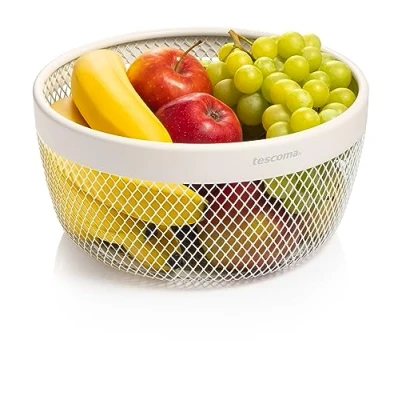 Basket for holding and serving fruit or bread Elegant and simple design for casual mise en place Made of a fine mesh produced in enamelled metal Dimensions: diameter 25 cm - height 12 cm Colour: white Wipe clean with damp cloth