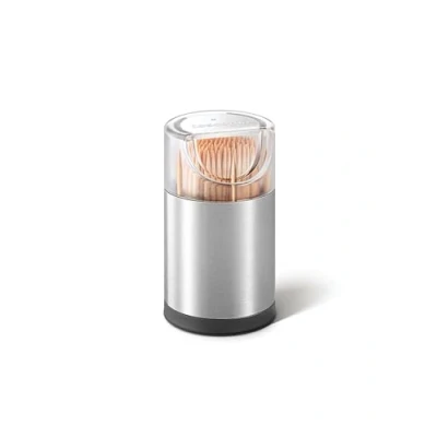 Toothpick dispenser with mechanism to distribute one by one Clear durable plastic dispenser Stainless steel container Dimensions: 4.5 cm, height 8 cm Toothpicks not included