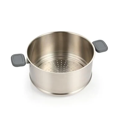 Steel steamer basket with plastic handles Perforated bottom to allow steam to rise up and cook delicately Fits all pots and casseroles with a diameter between 20 and 22 cm and requires a lid diameter of 22 cm Dishwasher safe Dimensions: diameter 22 cm - height 12 cm - width with handles 33.5 cm