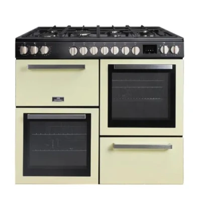 Tesla Dual Fuel Cooker Freestanding Cream, A/A/A Energy, 7 Burner Gas Hob, 100cm Double Cavity, 62L & Ovens, Easy Clean Enamel, LED Timer, (T100MCDFRCC)