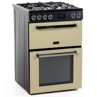 Tesla Dual Fuel Cooker Freestanding Cream, A/A+ Energy, 4 Burner Gas Hob, 60cm Double Cavity, 68L & 31L Ovens, Easy Clean Enamel, LED Timer, (TMRDF60C)
