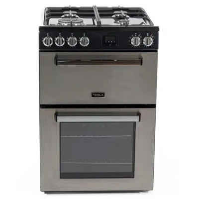 Tesla Dual Fuel Cooker Freestanding Stainless Steel, A/A+ Energy, 4 Burner Gas Hob, 60cm Double Cavity, 68L & 31L Ovens, Easy Clean Enamel, LED Timer, (TMRDF60SS)