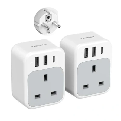 TESSAN UK to European Plug Adapter 2 Pack, USB C Travel Europe with 3 USB, 4 in 1 Type E F EU for Euro Spain France Turkey Germany Egypt Norway Iceland Greece Portugal Poland