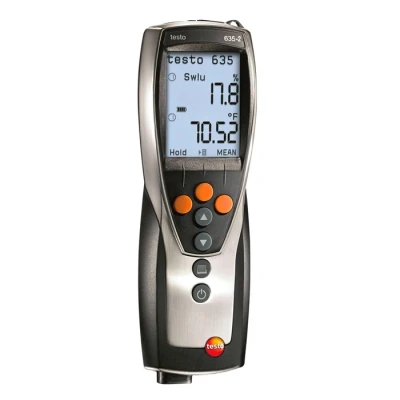 Testo 635-2 Thermohygrometer. Measures air temp (-40˚C to 150˚C), humidity (0-100% RH), surface temp. Internal memory, USB transfer. Compatible with radio/K probes. IP54 rated. Includes software, cable, battery.