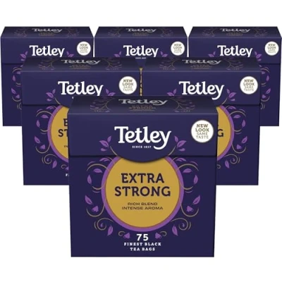 Tetley Extra Strong Tea, 6 x 75 Tea Bags Rainforest Alliance Certified Classic Black Teabags Bold, Rich Taste for a Full Flavoured British Brew at Breakfast or Anytime