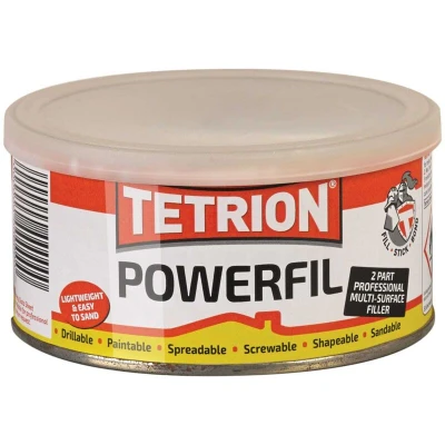 General description This high-performance Tetrion Powerfil 2-Part Filler is designed for quick and durable repairs on various surfaces. It sets rapidly, within approximately 15 minutes, and cures to a hard, smooth finish that can be drilled, sanded, or painted over. Suitable for both indoor and outdoor use, it effectively fills holes, cracks, grain defects, and knots in wood, as well as small holes and cracks in other hard surfaces. The formulation resists vibration, shrinkage, and cracking, ensuring a long-lasting repair. Technical specifications Type: 2-part filler Color: Straw (light beige) Pack size: 250ml Weight: approximately 250g Drying time: about 15 minutes Resistant to vibration, shrinkage, and cracking Compatibility and accessories Suitable for use on metals, wood, stone, concrete, and most plastics Can be painted with all types of paint Installation Mix the two components thoroughly before application Apply the filler into the hole or crack using a putty knife or spatula