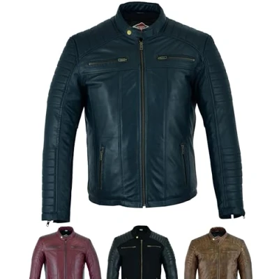 Texpeed Mens Casual Leather Jacket Real Genuine Soft Touch Sheepskin Biker Motorcycle Style Coat Navy L