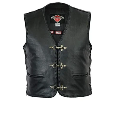 Texpeed Mens Real Leather Biker Waistcoat Vest Cut Genuine Motorcycle/Motorbike Quality Buckle Fish Hook Design With Braided Laced Black 10XL
