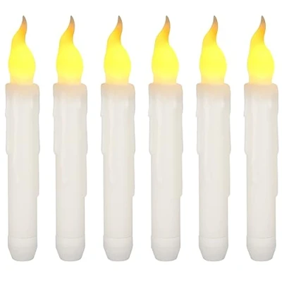 【REALISTIC APPEARANCE】- Diameter 0.79"D x 6.5"H which can fit a variety of taper candle holders and chandeliers. An excellent substitute for traditional taper candles. Set of 6 flameless taper candles are made of high-quality Ivory Plastic, Blinking slowly, looks beautiful and realistic. 【EASY TO USE】- Our battery-operated taper candles are easy to use. Removing the bottom cap, inserting 2 AA batteries (BATTERIES NOT INCLUDED), and tighten/lose the bottom cap of the candle for easy ON/OFF operation. 【SAFE FOR KIDS, SENIORS】- Without fire, smoke and These LED small tea light can be used without having to worry about flame, absolutely no fire hazards or burning risks, safe for families with pet(s) or young child(ren). 【MULTILE USAGE】- These realistic battery-operated taper candles come with warm yellow flickering flame, ideal for the dinner table, church, birthday, wedding, fireplace, Christmas, Halloween decoration. 【ORDER WITH CONFIDENCE】- If you have any problems please feel free to contact us. We will offer you satisfactory solutions.