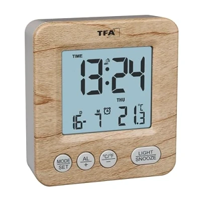 TFA Dostmann 60.2567.08 Digital Radio Alarm Clock with Wood Look, Controlled Clock, Travel Day of the Week and Date, Time Zones, Battery Operated, Wood, Brown