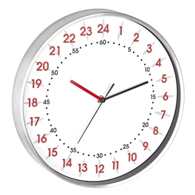24 Hours: analog wall clock with 24 hour dial with full day display and minute display, allows accurate readability Easy to read: thanks to the red hour and black minute hands, the current time is easy to read Wall clock: wall clock with aluminium frame and glass cover with ticking second hand Modern: the analogue clock fits perfectly into your living room, kitchen or office due to its simple design Box contents: the wall clock and the instruction manual are included (English language not guaranteed), the battery (1 x 1.5 V AA) must be ordered separately