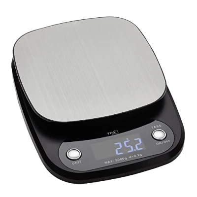 High load capacity: the household scale has a large and accurate measuring range from 0.5 to 5000 g, the measurement is carried out with a resolution of 0.1 g each Weighing: Comfortable weighing thanks to the tare weighing function, so several ingredients can be weighed together Digital scale: the kitchen scale is easy to read thanks to the digital display and illuminated LCD display Design: The digital food scale has a modern design and a weighing surface in stainless steel with non-slip stand thanks to rubber pads, please remove blue protective film Extended shut-off function: thanks to the extended shut-off function, you can also weigh several things for a longer time, the scale turns off only after 2 minutes