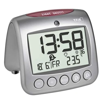 TFA Dostmann Digital Radio Alarm Clock with Temperature Sonio 2.0, 60.2559.54, Two Alarms, Display Indoor Temperature/Weekday/Date, Silver, (L) 112 x (W) 98 (H) mm