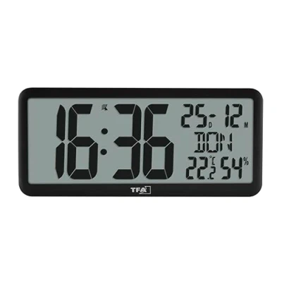 LARGE LED DISPLAY & XL NUMBERS: digital wall clock is instant and easy to read from a distance, ideal for living room, office, school or workshop; also suitable for seniors or people who wear glasses Digital radio-controlled clock: always know the time exactly to the second thanks to the automatic time setting via the radio signal DCF77, a manual change from summer to winter time is omitted, time zone setting (+12/-12h) Room temperature and humidity: Built-in thermo-hygrometer for measuring the indoor temperature between -10 to +50 °C and the humidity between 20 and 99 percent, the optimal indoor climate is between 40 to 60 percent and 18 to 23 °C Calendar display: In addition to the time, the date and day of the week (7 languages adjustable) are also displayed on the large LCD display Modern and battery operated: wall clock with slim design, ideal for open-plan office, living room or garages, is battery operated (4 x AA - not included), includes 6 language instruction manual (English language not guaranteed)