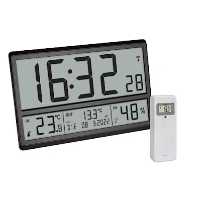 Precise time keeping: display of the time thanks to radio transmission and more precise radio clockwork, this means that the modern and clear wall clock never needs to be changed, radio clock can also be switched off and has a time zone setting Temperature display: thanks to the built-in thermometer, you can always see the current indoor temperature and humidity in your home or office, thanks to the outdoor sensor, you always get the current outdoor temperature Digital clock: the digital display of the XL wall clock shows the day of the week as well as the full date, you can also switch between a large display of the time or outside temperature Large display: the XL display can be easily read from a long distance and is therefore perfect for the entrance or reception area, waiting room and office Additional functions: the digital radio clock is silent and also has an alarm with snooze function, the wall clock can be hung or standed