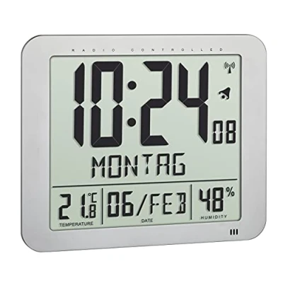 Radio-controlled clock: digital wall clock has a built-in radio clock, which always sets the correct time according to DCF-77, optionally the clock can also be set manually or the respective time zone Hygrometer: The display can also read the current indoor temperature and humidity, making it ideal for the home, office or waiting room Alarm function: the table clock also has two different alarm functions (Mon-Fri and Mo-S), in addition, the alarm can be interrupted in snooze mode for a few minutes Display: clear and easy to read digital display, with written out day of the week in 10 languages (German, French, Italian, Spanish, Danish, Dutch, Czech, Polish, Swedish and English) Box contents: the wireless wall clock and the instruction manual are included, the batteries 4 x 1.5 V AA must be ordered separately