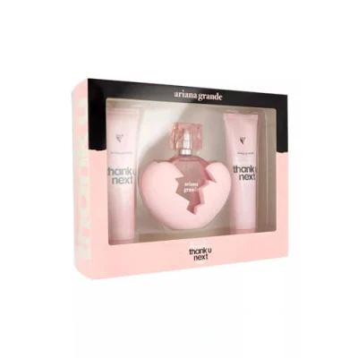 Thank U Next by Ariana Grande for Women 3 Pc 3.4oz EDP Spray, Body Souffle, Bath Shower Gel