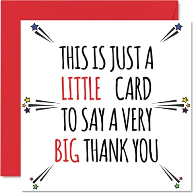 MAKE THEM SMILE WITH THIS THANK YOU CARD: This exceptional quality thank you card for her or him shows the design "This is just a little card to say a very big thank you". If you are looking for thank you greetings cards for men, then then these thank you cards are bound to make them smile. Not just for an appreciation gifts for women this could also be for School Teacher, Music Teacher, PE Teacher, Headteacher, Childminder, Sports or Football Coach. WHAT DO YOU GET: The card is printed on one side and BLANK ON THE INSIDE to allow you to write your very own message. The unique fun design is printed on a specially sourced and environmentally responsible board. At 360 microns thick the natural white one-sided gloss board has a quality look and feel. Supplied with a coloured gummed envelope to complement the design and ready to be sealed and sent in the post. Thank you card single, NO INK SMUDGES: There is nothing worse than writing inside a card to find that the shiny surface makes the ink smudge. This is why we use a high quality one sided coated board. The uncoated side will absorb more of the ink from your pen to make smudging a thing of the past. Thank you cards single, thank you teacher gifts, football thank you cards, kids thank you cards. SIZES: Greeting Card = 145mm x 145mm, Envelope = 155mm x 155mm, Card Thickness = 360 micron. Great thank-you cards from kids. Thank you cards for kids, childrens thank you cards, large thank you card, thankyougift, coach me cards, teacher gifts cards, thank you for helping me grow. MADE AND QUALITY CHECKED IN THE UK: We print and manufacture all our product right her in the UK so you can be sure of a fast turnaround and a product that is expertly made. Using environmentally responsible premium board our card is conscious of the responsible management of the world's forests - thank you cards teacher, thank you gifts for teacher, thank you team gifts.