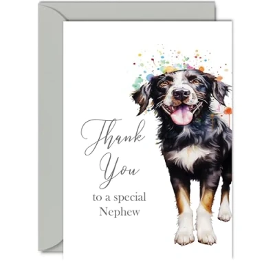 Make them smile with this special thank you card - This exceptional quality thank you card for Him shows the design Party Dog saying 'Thank You to a special Nephew'. If you are looking for awesome thank you greetings cards for Boys or thankyou card for Him then then this thanks card is bound to make them smile. This could also be a thank you gifts for Nephew What's Inside - Print showcasing a lovely verse, 'My Sincerest Thank You for Everything' as seen in the second image. There's ample space for your own personal message. Crafted on a 360-micron thick, environmentally responsible board, this one-sided gloss board offers a luxurious look and feel. Paired with a colored gummed envelope that complements the design, it's ready to be sealed and sent, making it a truly special birthday gesture. Ink Perfection: Say goodbye to ink smudges! Our high-quality one-sided coated board ensures a smooth writing experience without the worry of smudging. The uncoated side absorbs ink, providing a flawless finish that adds to the card's overall premium quality.Nephew thank you cards, Nephew thank you card, Boys thank you card. Thank you card for Nephew, Male thank you cards. Dimensions that Impress: Greet with grandeur using a card sized at 127mm x 178mm, accompanied by an envelope measuring 130mm x 180mm. The card boasts a thickness of 360 microns, ensuring a substantial and impressive presence. Nephew thank you cards from Auntie or Uncle Great Nephew thank you card, thank you cards for Nephew, thank you card Nephew. British Craftsmanship: Proudly crafted and quality-checked in the UK, our birthday cards are a testament to expert design and manufacturing. Utilizing Forest Stewardship Council certified board, we contribute to responsible forest management. Expect a swift turnaround and a product that reflects the highest standards of quality. Auntie Uncle thank you cards, brilliant Male thank you cards.