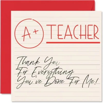MAKE THEM SMILE WITH THIS HEARTFELT THANK YOU CARD: This exceptional quality thankyou card for her or him shows the design of an A+ Teacher Note with the heartfelt message "Thank You For Everything You've Done For Me!". If you are looking for funny thank you greetings cards for men, then then this thank you card is bound to make them laugh. Not just for an appreciation gifts for School, Music or PE Teacher, Headteacher, Childminder, Sports Coach or Colleague. WHAT DO YOU GET: The card is printed on one side and BLANK ON THE INSIDE to allow you to write your very own message. The unique manly design is printed on a specially sourced and environmentally responsible board. At 360 microns thick the natural white one-sided gloss board has a quality look and feel. Supplied with a coloured gummed envelope to complement the design and ready to be sealed and sent in the post. NO INK SMUDGES: There is nothing worse than writing inside a card to find that the shiny surface makes the ink smudge. This is why we use a high quality one sided coated board. The uncoated side will absorb more of the ink from your pen to make smudging a thing of the past. SIZES: Greeting Card = 145mm x 145mm, Envelope = 155mm x 155mm, Card Thickness = 360 micron. MADE AND QUALITY CHECKED IN THE UK: We print and manufacture all our product right her in the UK so you can be sure of a fast turnaround and a product that is expertly made. Using environmentally responsible premium board our card is conscious of the responsible management of the world's forests.