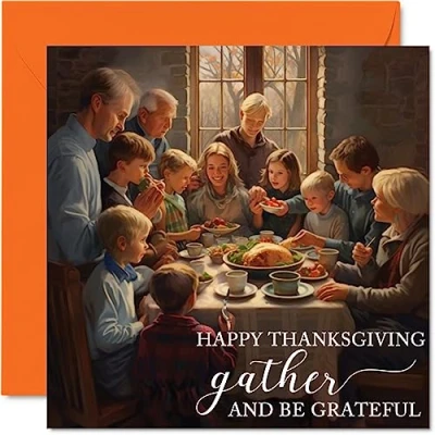 MAKE THEM SMILE WITH THIS SPECIAL CARD THANKSGIVING: This exceptional quality thanksgiving card for them shows a design of a family gathering at thanksgiving with the wording "Happy Thanksgiving. Gather and be grateful". If you are looking for cards to show gratitude and give thanks, then then this card is just what you are looking for. This could also be for Mom, Dad, Son, Daughter, Grandad, Nanny, Cousin, Auntie or Uncle. WHAT DO YOU GET: The card is printed on one side and BLANK ON THE INSIDE to allow you to write your very own message. The unique design is printed on a specially sourced and environmentally responsible board. At 360 microns thick the natural white one-sided gloss board has a quality look and feel. Supplied with a coloured gummed envelope to complement the design and ready to be sealed and sent in the post.. NO INK SMUDGES: There is nothing worse than writing inside a card to find that the shiny surface makes the ink smudge. This is why we use a high quality one sided coated board. The uncoated side will absorb more of the ink from your pen to make smudging a thing of the past. thanksgiving family cards, designer thanksgiving cards, thanksgiving gift cards, gifts for couples at thanksgiving. SIZES: Greeting Card = 145mm x 145mm, Envelope = 155mm x 155mm, Card Thickness = 360 micron. Thankgiving card to mom, special family thanksgiving card, thanksgiving party cards, thanksgiving cards. MADE AND QUALITY CHECKED IN THE UK: We print and manufacture all our product right her in the UK so you can be sure of a fast turnaround and a product that is expertly made. Using environmentally responsible premium board our card is conscious of the responsible management of the world's forests.