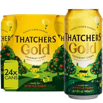 Thatchers Gold: A medium dry cider with a smooth, golden colour, blended from classic West Country apples including Dabinett and Harry Masters Jersey. Crisp, refreshing, and full of character. Our Story: Family-run since 1904 at Myrtle Farm in Somerset, Thatchers has spent over a century crafting cider with care, passion, and expertise. Every bottle reflects generations of orchard knowledge and a love for doing things properly. Craft & Quality: Gold is blended from our favourite bittersweet apples, pressed and fermented to perfection. It embodies the very best of cider making, delivering a consistently premium, full-bodied taste in every pint. Sustainability & Responsibility: All our ciders are crafted through sustainable practices, such as being made using 100% renewable electricity, including power from the 3,500 solar panels on the roof of our farm. That means all our ciders are as good for the environment as they taste in the glass. Serve & Enjoy: A true cider drinker’s cider. Enjoy it chilled with friends at the pub, watching the big match on TV, or paired with a Friday night curry.
