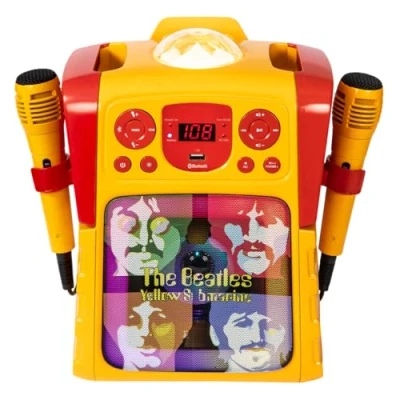 Sing Along in Beatles Style – Officially Licensed Yellow Submarine karaoke machine with iconic design, vibrant LED disco lights, and top-loaded crystal ball for a real party feel. Portable & Rechargeable – Built-in battery and USB-C charging make it easy to take the party anywhere. Enjoy hours of unplugged performance fun. Bluetooth Streaming & Easy Connectivity – Connect your phone, tablet or MP3 player to stream thousands of FREE karaoke tracks via the Easy Karaoke app or record performances via USB. 2 Wired Microphones & Voice Effects – Perfect for duets and karaoke battles. Features echo and voice changer settings for fun and dramatic vocal effects. Multi-Coloured Light Show – Front panel LEDs and disco ball pulse to your music for an immersive karaoke atmosphere kids and adults will love.