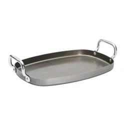 25(H) x 260(W)mm. Carbon Steel. Silver. Made in France. Aluminium riveted handles. Suitable for all heat sources including induction. Requires seasoning prior to use. Perfect for high heat cooking.