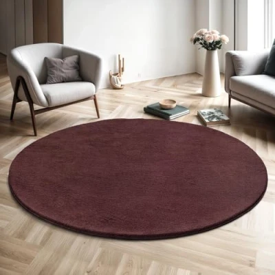 the carpet Relax Modern Fluffy Short Pile Rug, Non Slip Underside, Washable up to 30 Degrees, Super Soft, Fur Look, Bordeaux, 200 cm round