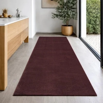 the carpet Relax Modern Fluffy Short Pile Rug, Non Slip Underside, Washable up to 30 Degrees, Super Soft, Fur Look, Bordeaux, 80 x 300 cm