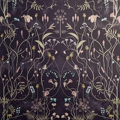 An art nouveau floral design celebrating the romance of a wild meadow. Delicate flowers are in full bloom as their stems elegantly twist and intertwine. Shown here in the night shadow colourway, with a rich and dramatic purple ground.