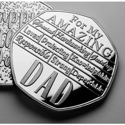 .999 Silver Plated Father's Day Commemorative. For My Amazing, Special, Hardworking, Guiding, Loved, Protecting, Knowledgeable, Responsible, Strong, Dependable Dad - Happy Father's Day! Weight 8g and Diameter 27mm - The last picture is the item shown next to a 50p coin - a perfect gift for collectors. A perfect gift to commemorate your Dad on Father's Day. Proof finish, mint condition. Unique design, exclusive item. Also available in a 24ct Gold finish, in a capsule and in various gift box/cases.