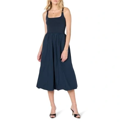 The Drop Tina Scoop Neck Mixed Media Bubble Hem Midi Dress, Maritime Navy, XXS