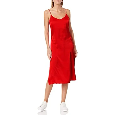 The Drop Women's Ana Silky V Neck Midi Slip Dress, Red, M
