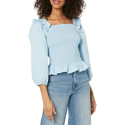 The Drop Women's Marisol Long Sleeve Ruffle Smocked Cropped Top, Sky Blue, S