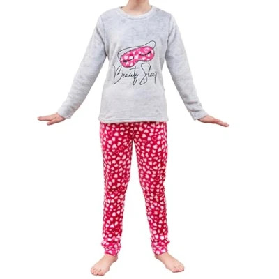 Super Soft & Comfortable Fabric: This girls pyjama set features luxuriously soft flannel fleece that feels smooth, gentle and comforting against the skin. Lightweight yet warm, it’s perfect for children’s nightwear, sleepwear or loungewear—ideal for bedtime, relaxing at home or lazy weekend mornings. Warm & Cosy for Cold Nights: Crafted to provide excellent insulation, the premium fleece fabric helps retain body heat to keep your child warm on autumn and winter nights. This cosy girls pyjama set is perfect for chilly evenings, offering all-night comfort whether she’s getting ready for bed or enjoying quiet time at home. Elasticated Neck Rib for Easy Dressing & Comfort: The top features a soft, elasticated ribbed neckline, making it easy to slip on and off while providing a secure and comfortable fit. The stretch neck opening is ideal for younger children and supports easy, fuss-free dressing. Machine Washable & Low Maintenance: This girls fleece loungewear and sleepwear set is fully machine washable at 40°C, making it a practical option for everyday use. The fabric is quick-drying, maintains its softness after washing and resists shrinking—ideal for busy households and regular wear. Lovely Gift Idea – Available in Sizes & Colours: Whether you’re buying for your daughter, granddaughter, niece or as a gift for girls, this cute and cuddly pyjama set makes a great choice for birthdays, Christmas, sleepovers or simply everyday nightwear. Available in a variety of beautiful colours and sizes to suit girls of all ages. Safety Warning: Keep away from fire and flames