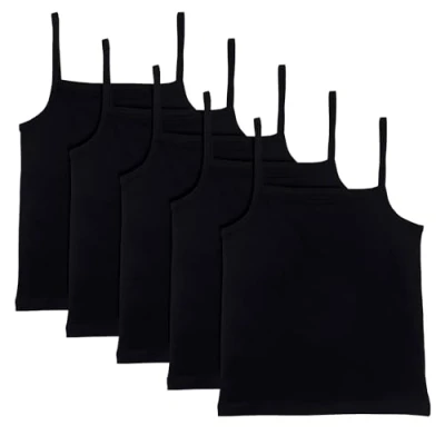 Girls 5-Pack Cami Vests: Enhance her wardrobe essentials with our Girls 5-Pack Cami Vests, offering both quality and quantity in this convenient multipack camisole for girls. Made from 100% cotton, these girls cami vests provide a soft and comfortable layer. Ideal for everyday wear, they offer versatility and style, making them an essential addition to her wardrobe. Sleeveless Design: Our girls cami vests feature a sleeveless design, providing enhanced comfort and freedom of movement. Perfect for layering under clothing or wearing on their own, these sleeveless girls undershirts ensure all-day comfort and unrestricted movement, allowing your child to move freely and stay comfortable. Soft Hand Feel: These girls cami vests offer a soft hand feel, crafted from soft-touch cotton fabric that ensures a luxurious touch against the skin. The carefully selected material priorities comfort, allowing girls to wear them all day without experiencing any discomfort or irritation. Sizes 4 to 13 Available: Our girls cami vest pack provides a comprehensive range of sizes from 4 to 13, ensuring an ideal fit for various body types. This 5-pack girls cami vest set is available in black colours, offering versatility and style for daily wear. Machine Washable at 40°C: Enjoy effortless maintenance with these multipack cami vests for girls, as they are conveniently machine washable at 40°C. This ensures easy care and long-lasting freshness, allowing you to keep them clean and ready for wear with minimal effort.