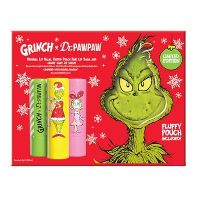 Lip Care Trio: A Limited Edition Lip Care Gift Set featuring three 4g products, Peach Pink Balm, Candy Cane Lip Scrub and Original Balm, plus a branded pouch for a complete exfoliating and hydrating lip routine. Gentle Exfoliation: The Candy Cane lip scrub helps gently buff away dry, flaky skin, leaving lips feeling smoother and better prepared for hydration as part of a simple two step lip care routine. Hydrating Care: The Original Pawpaw balm and Peach Pink tinted balm help nourish and moisturise lips, supporting softness, comfort and smoothness while adding the option of subtle colour. Everyday Use: Use the lip scrub as needed to exfoliate, then apply the Original balm for clear hydration or Peach Pink balm for a soft flush, ideal for daily routines and on the go care. Vegan Formula: Made with vegan ingredients and cruelty free, this festive lip care trio is suitable for all skin types and makes a fun, giftable stocking stuffer for The Grinch fans.