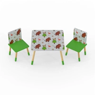DESIGN THEME: Charming Gruffalo-themed furniture set featuring beloved characters including Gruffalo, Mouse, Fox, and Owl on a grey background with green accents SET CONTENTS: Complete children's furniture set includes one rectangular table and two matching chairs with character-printed backrests CONSTRUCTION: Sturdy wooden legs with green-painted finish provide stability, whilst the table and chair surfaces offer easy cleaning, wipe with dry cloth. No harsh chemicals should be used! CHILD-FRIENDLY: Perfect size for toddlers and young children, with comfortable seating and appropriate table height for activities. 18 months to 6 years old recommended age group. DECORATIVE APPEAL: Delightful woodland pattern featuring trees and characters makes this set an enchanting addition to any child's room or play area