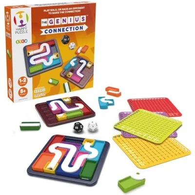 EXCITING PUZZLE GAMEPLAY: Race solo or challenge an opponent to connect start and end points while filling the gameboard with colorful puzzle pieces. STEM LEARNING FUN: Combines logic, problem-solving, and strategy, making it the perfect educational activity for kids and adults alike. ENDLESS CHALLENGES: Roll the dice for random setups or select from starter to expert levels using included challenge cards for hours of fun. PERFECT FOR ALL AGES: Suitable for players aged 6 to adult, offering solo or competitive gameplay for families, friends, and game enthusiasts. ADD TO YOUR GENIUS COLLECTION: A must-have for fans of The Genius Square, this game guarantees a unique and entertaining board game experience., Manufacturer: The Happy Puzzle Company