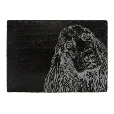 Durable and versatile, this Just Slate Company Cocker Spaniel Slate Cheese Board is just the thing for presenting and serving your favourite cheeses.The delightful slate cheese board has been handcrafted in Scotland and is engraved with a gentle cocker spaniel. A foam backing protects surfaces.This rectangular slate cheese board would make an ideal present, especially as a housewarming or wedding gift, and is a must for those with an appreciation for cocker spaniels.Slate cheese board dimensions: 35cm x 25cm. Wipe clean.Combine the Just Slate Company Cocker Spaniel Slate Cheese Board with slate place mats and coasters for a coordinated look.