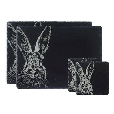 Handcrafted in Scotland, The Just Slate Company Hare Slate Coaster & Place Mat Set lets you create the perfect country living kitchen or dining table setting for two. Engraved with a long eared and inquisitive hare, this slate coaster and place mat set has a food safe coating and features foam backing to protect surfaces.This delightful set comes gift boxed, and would make a tasteful gift for any occasion, especially as a house warming present.Dimensions: Place mats - 30cm x 22cm. Coasters - 11cm x 11cm. Wipe clean.The Just Slate Company Hare Slate Coaster & Place Mat Set includes two place mats and two coasters.