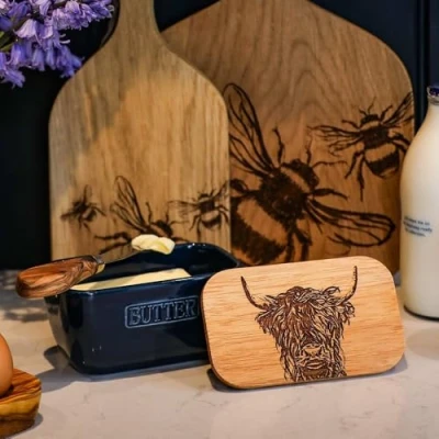 The Just Slate Company Highland Cow Blue Butter Dish is a captivating addition to your tableware collection, combining functionality with rustic beauty. Perfect for serving butter, this dish enhances your dining experience.Crafted with a food-safe ceramic base and an oak lid, it showcases a pleasing combination of materials that reflects the charm of the Scottish Highlands. Its unique design makes it a delightful feature on any table.Dimensions: 14.5(L) x 9(W) x 8(H) cm. Weight: 0.61 kg.Engraved and finished in Fife, Scotland.Care instructions: Ceramic base – dishwasher safe; oak lid and seal – hand wash and dry flat.