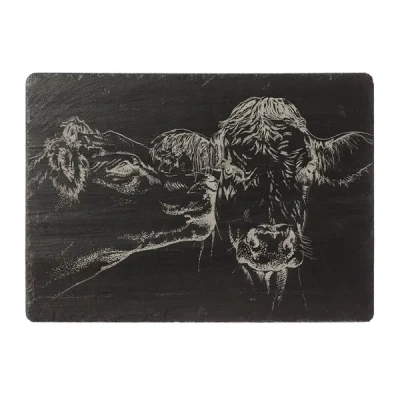 Durable and versatile, this Just Slate Company Kissing Cows Slate Cheese Board is just the thing for presenting and serving your favourite cheeses.The delightful slate cheese board has been handcrafted in Scotland and is engraved with a pair of kissing cows. A foam backing protects surfaces.This rectangular slate cheese board would make an ideal present, especially as a housewarming or wedding gift.Slate cheese board dimensions: 35cm x 25cm. Wipe clean.Combine the Just Slate Company Kissing Cows Slate Cheese Board with slate place mats and coasters for a coordinated look.