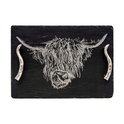 Featuring striking stainless steel cow horn shaped handles, this Just Slate Company Medium Highland Cow Slate Serving Tray is ideal for presenting your favourite appetisers on. Perfect for meats, cheese and crackers, canapes or a selection of nibbles.This high quality slate serving tray has been handcrafted in Scotland and is engraved with a shaggy and loveable highland cow.This slate serving tray is supplied in a gift box and would make an ideal present, especially as a housewarming or wedding gift.Slate serving tray dimensions: 35cm x 25cm. Wipe clean.Combine the Just Slate Company Medium Highland Cow Slate Serving Tray with matching place mats and coasters for a coordinated look.