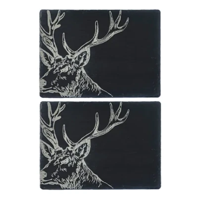 Protect your table from hot temperatures and scratches with the Just Slate Company Set of 2 Stag Slate Place Mats. Handcrafted in Scotland and engraved with a noble and majestic stag, each unique and quirky place mat has a food safe coating and a foam backing to protect surfaces.Place mat dimensions: 30cm x 22cm. Wipe clean.Combine the Just Slate Company Set of 2 Stag Slate Place Mats with the matching engraved stag coasters and table runner for a coordinated look.