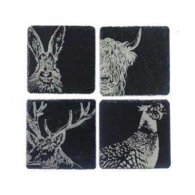 Beautifully handcrafted in Scotland, the Just Slate Company Set of 4 Country Animals Slate Coasters make a lovely table piece for your guests to set their drinks on. Each square slate coaster has been engraved with a stunning hand-illustrated engraving of a British country animal, including a highland cow, a stag, a hare and a pheasant.These unique and quirky slate coasters from the Just Slate Company have a food safe coating and foam backing to protect surfaces.Coaster dimensions: 11cm x 11cm. Wipe clean.