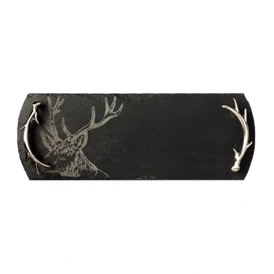 Featuring striking stainless steel antler shaped handles, this Just Slate Company Small Stag Slate Serving Tray is ideal for presenting your favourite appetisers on. Perfect for meats, cheese and crackers, canapes or a selection of nibbles.This high quality slate serving tray has been handcrafted in Scotland and is engraved with a noble and majestic stag.This slate serving tray is supplied in a gift box and would make an ideal present, especially as a housewarming or wedding gift.Slate serving tray dimensions: 42cm x 15cm. Wipe clean.Combine the Just Slate Company Small Stag Slate Serving Tray with matching place mats and coasters for a coordinated look.
