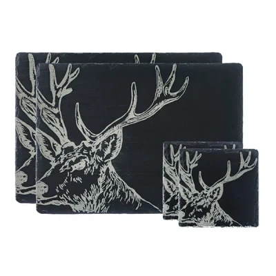 Harts of SturHandcrafted in Scotland, The Just Slate Company Stag Slate Coaster & Place Mat Set lets you create the perfect country living kitchen or dining table setting for two. Engraved with a noble and majestic stag, this slate coaster and place mat set has a food safe coating and features foam backing to protect surfaces.This delightful set comes gift boxed, and would make a tasteful gift for any occasion, especially as a house warming present.Dimensions: Place mats - 30cm x 22cm. Coasters - 11cm x 11cm. Wipe clean.The Just Slate Company Stag Slate Coaster & Place Mat Set includes two place mats and two coasters.