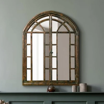 The Kirkby Dark Metal Rustic Framed Arched Wall Mirror with Opening doors 43" X 31" (110CM 78CM max). Closed 24" (78cm 61cm).